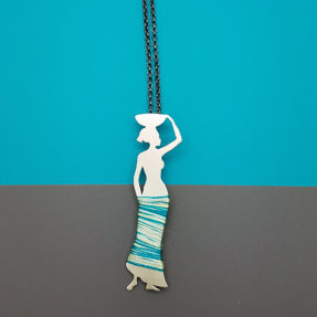 Head Carrying Africa woman silver necklace with black nickel-free chain and silver claps. Engraved to make the details and decorated with yellow, petrol thread, red or blue.